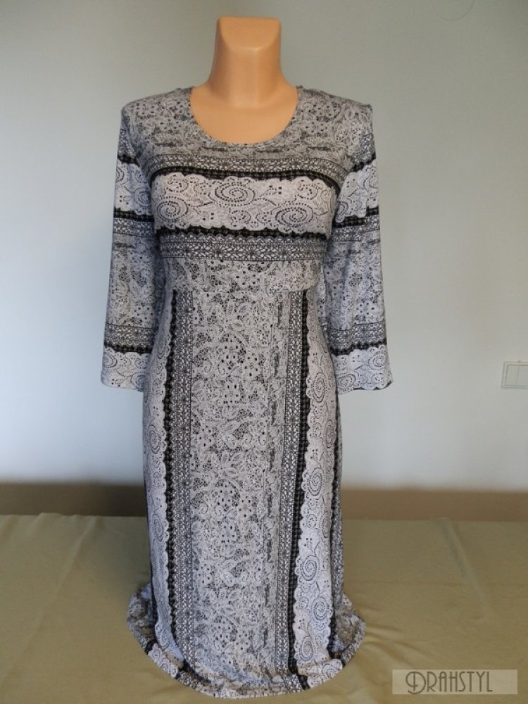 Šaty v délce 95, 103 cm, vhodné do společnosti , nebo i pro běžnou příležitost.Nevíte-li co si obléknout na svatbu myslím, že toto je to pravé.Krajka je na látce jen natištěna takže šaty jsou velice příjemné na těle s hladkým povrchem, splývavý úplet.