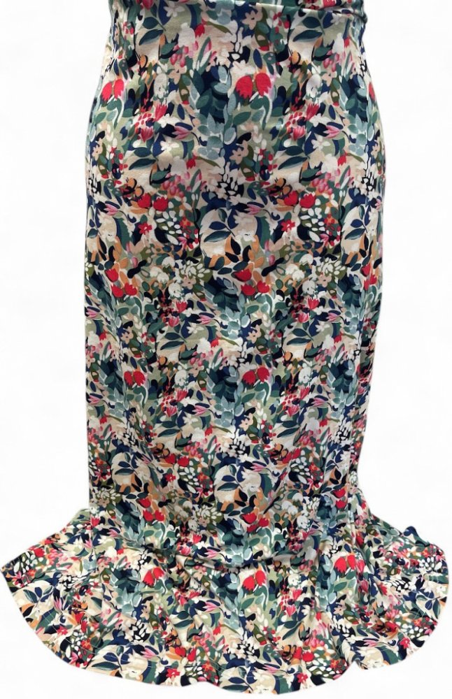 Kvítkovaná sukně v pase všitá guma, délka a střih b menu, viskozový úplet.