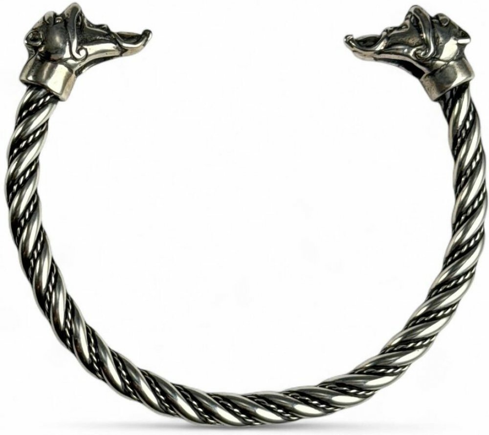 Stříbrný náramek inspirovaný berserkery, válečníky severu, kteří v bitvách propadali bojovému šílenství. Berserkeři nosili zvířecí kůže – nejčastěji medvědí – a věřilo se, že přijímají sílu a divokost těchto tvorů. Masivní zakončení náramku v podobě lidské hlavy s mědvědí kožešinou odkazuje na odvahu, sílu a nezlomného ducha válečníka.