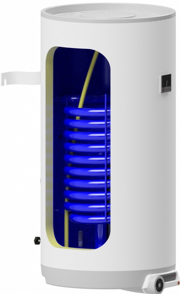 Svislý zásobník teplé vody s jedním výměníkem vhodným k různým zdrojům tepla a s možností připojení elektrického topného tělesa (např. k fotovoltaickému systému).