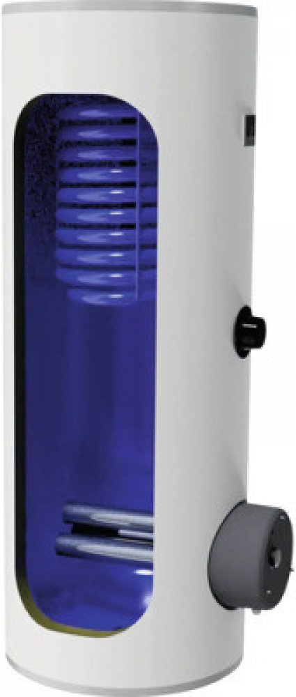 Stacionární zásobník teplé vody s boční přírubou a jedním výměníkem, vhodný k různým zdrojům tepla a má možnost instalace topného tělesa.