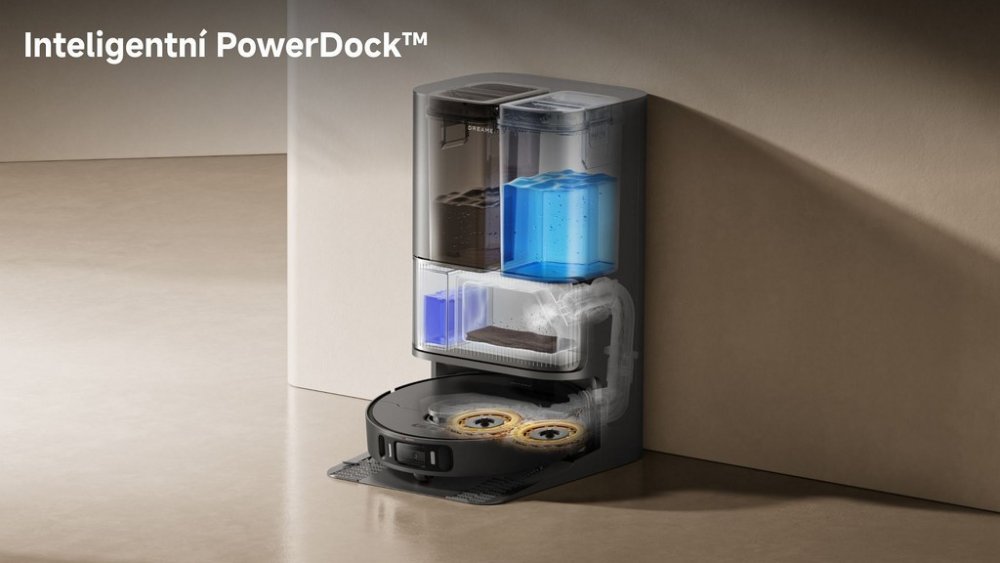 Dokovací stanice PowerDock zajišťuje kompletní automatickou údržbu. Po dokončení úklidu se mopovací podložky automaticky vyčistí horkou vodou o teplotě 75°C a následně vysuší horkým vzduchem pro prevenci vzniku plísní a zápachu. Systém automatického vyprazdňování přesune nečistoty do velkého prachového sáčku o objemu 3,2 L, který vystačí až na 75 dní provozu.