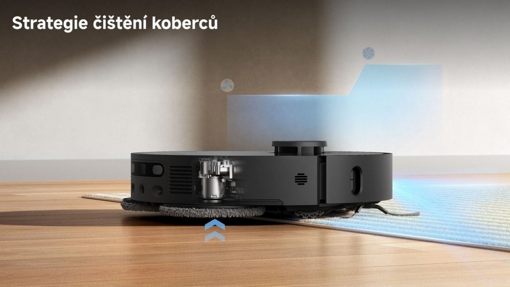 S 32 úrovněmi regulace vlhkosti se dokonale přizpůsobí každému povrchu. Funkce zdvihnutí mopu o 10,5 mm chrání koberce před nadměrnou vlhkostí. Díky této technologii můžete bez obav kombinovat vysávání a vytírání v jednom cyklu úklidu, přičemž robot automaticky přizpůsobí svůj režim podle typu podlahy.