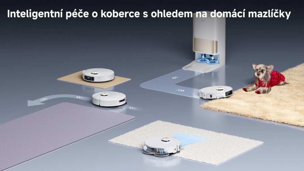 Při detekci koberců se automaticky zvednou mopovací podložky a aktivuje se funkce CarpetBoost