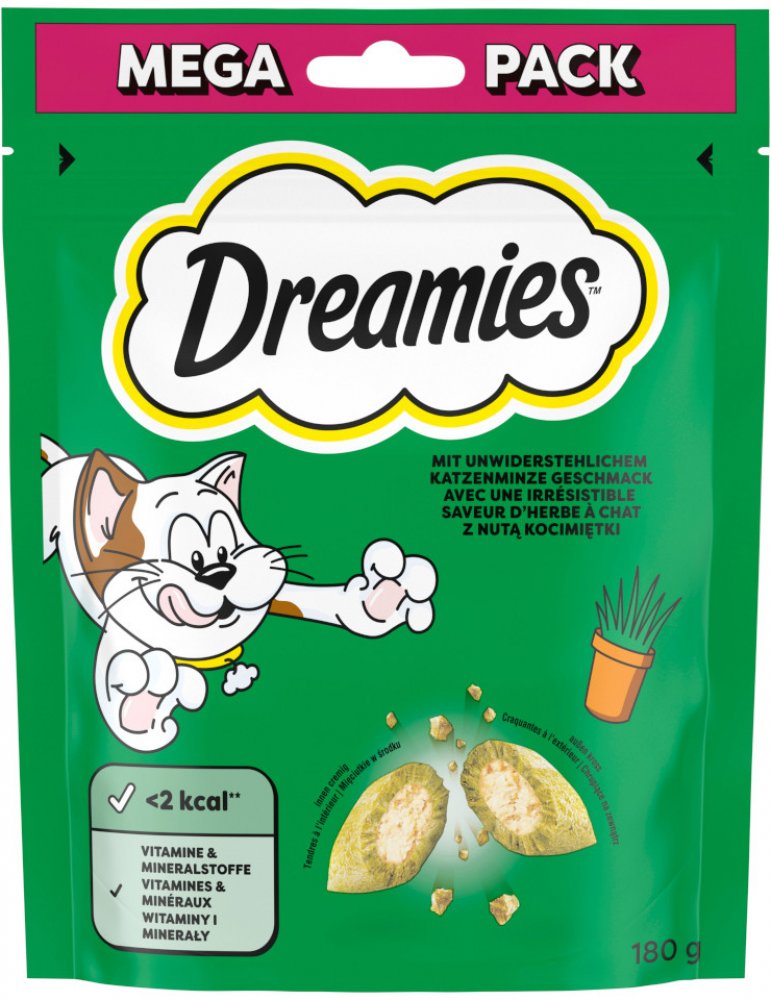 Výborné křupavé kočičí pamlsky s krémově měkkou náplní: o tom vaše kočka určitě sní. S kočičími pamlsky Dreamies Mega Pack v sáčcích o hmotnosti 180 g se přání vaší kočky konečně splnilo. Křupavý povrch a měkkou náplň si jistě oblíbí. Dreamies mix pamlsky obsahují důležité vitamíny a minerály - ideální pro vyvážený život vaší kočky. Pamlsky jsou navíc nízkokalorické , 1 kus obsahuje pouze 2 kcal. Můžete tak své kočce dopřát pamlsek bez výčitek svědomí. Praktické, znovu uzavíratelné balení udržuje kočičí pamlsky vždy čerstvé. Vaše kočka si je jistě zamiluje. Dreamies mix pochoutka: Doplňkové krmivo pro dospělé kočky a dospívající kočky starší 8 týdnů Dvojí struktura: křupavá na povrchu a krémově jemná uvnitř. S vitamíny a minerály: pro vyváženou stravu Nízkokalorické: pouze 2 kcal na kus - ideální jako svačinka Rozmanitost: k dispozici v různých příchutích Výborná svačinka: v praktickém 180g sáčku Bez umělých dochucovadel