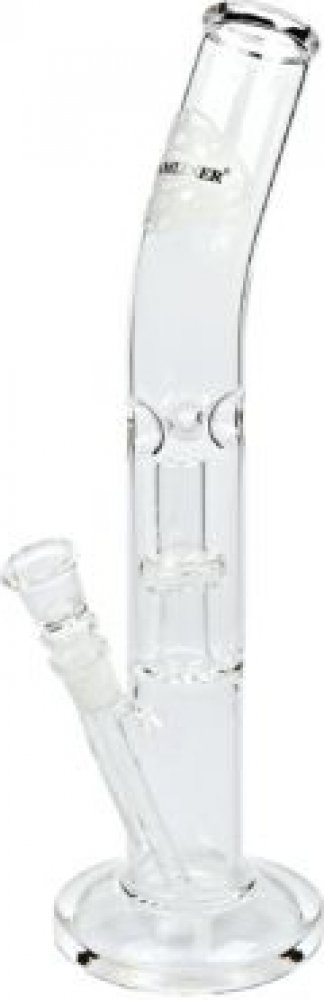 Klasický zahnutý skleněný bong s perkolací značky Dreamliner. Kvalitně zpracovaný ice bong s masivní základnou je na čelní straně zdobený výrazným logem. Transparentní bong je vybavený "výstupky" pro udržení kostek ledu k ochlazení kouře a perkolací Slitted Showerhead, která kouř rozdělí a tím napomůže k jeho ještě většímu ochlazení. Skleněný bong je zakončený silnějším hrdlem a je vyrobený z tepe...