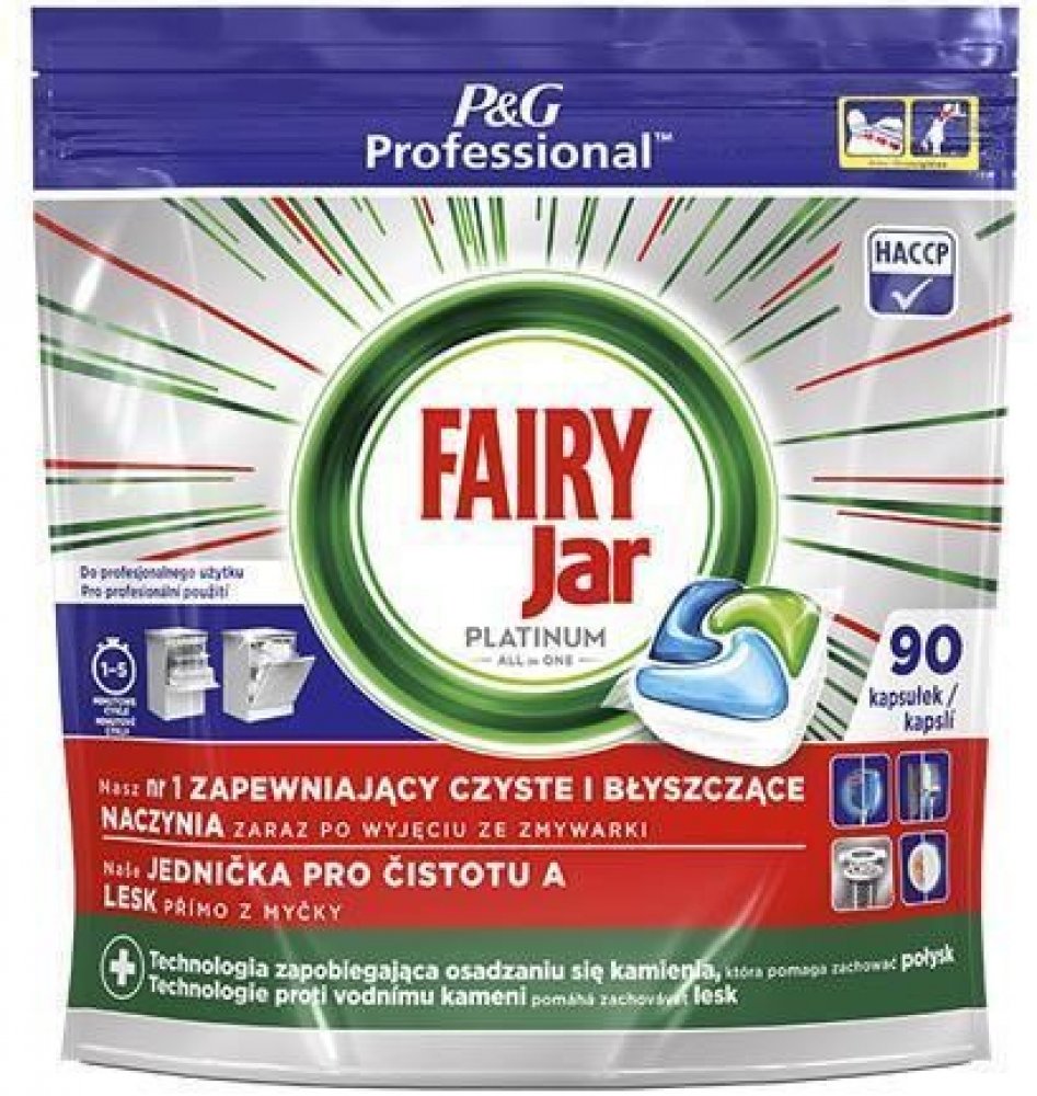 Kapsle Jar Professional Platinum jsou vyvinuty pro mytí nádobí v myčkách jak pro domácí tak průmyslové použití. Povrchově aktivní látky zajistí dokonalé odstranění zbytků jídel a mastnoty z nádobí a jejich uzamčení ve vodě, což zabraňuje jejich opětovnému usazení na příborech, talířích a skle. Perfektně čistí filtr a zanechávají myčku čistou a nádobí perfektně lesklé. Účinně myjí již od teploty 30...