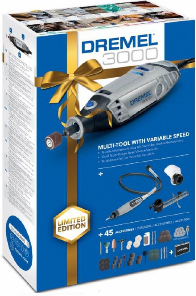 Multifunkční nářadí 3000-3/45 od značky Dremel s vyměnitelným příslušenstvím a nástavci vám umožní zvládnout všechny detailní práce s jediným nástrojem a dosáhnout bezchybných výsledků. Řezání, zařezávání, leštění – to vše zvládnete s DREMEL 3000. Díky promyšlené konstrukci větráku, bočním průduchům a motoru s kuličkovými ložisky je zajištěn chladný a tichý chod motoru s nízkými vibracemi i při vysokém zatížení. Symetrický design a lehký kryt poskytují pevný a pohodlný úchop, což zajišťuje snadné ovládání a práci bez únavy. Mějte nad svými projekty naprostý přehled. Součástí dodávky je velká sada 45 příslušenství a ohebná hřídel, vše je uloženo v praktickém kufru s držákem.