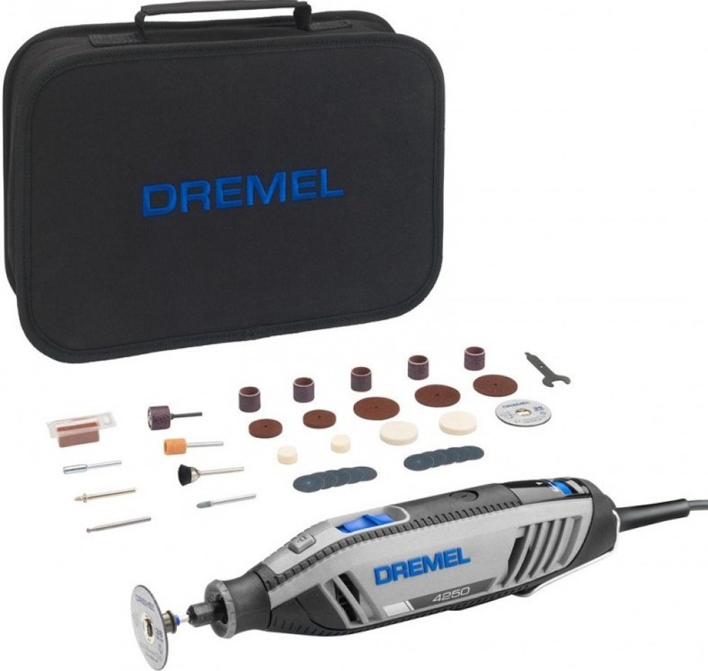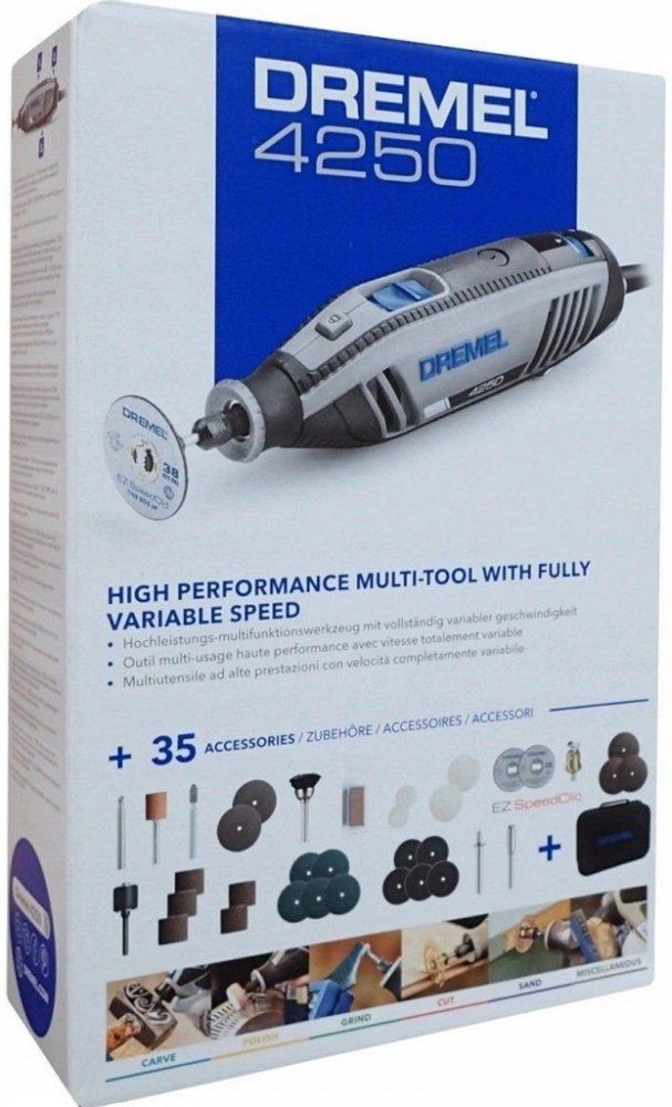 U nářadí Dremel® 4250 se maximální výkon doplňuje s vysoce kvalitní a odolnou konstrukcí. Tato sada je dodávána s multifunkčním nářadím Dremel 4250, 35 kusy příslušenství a textilní taškou, ideální pro vaše náročné kutilské projekty.