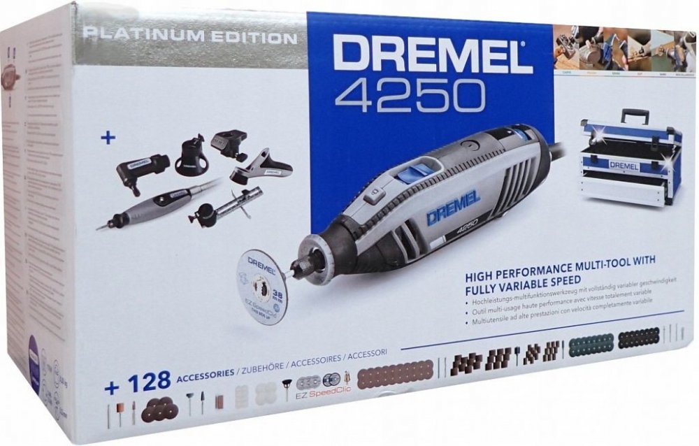Dremel® 4250 vám zajišťuje dokonalý zážitek s neomezeným výkonem. S touto nejexkluzivnější sadou Dremel 4250 můžete řezat, vyřezávat, brousit, leštit, rýt a mnoho dalšího. Obsahuje 128 kusů příslušenství a 6 nástavců pro všechny možné aplikace a kutilské projekty.