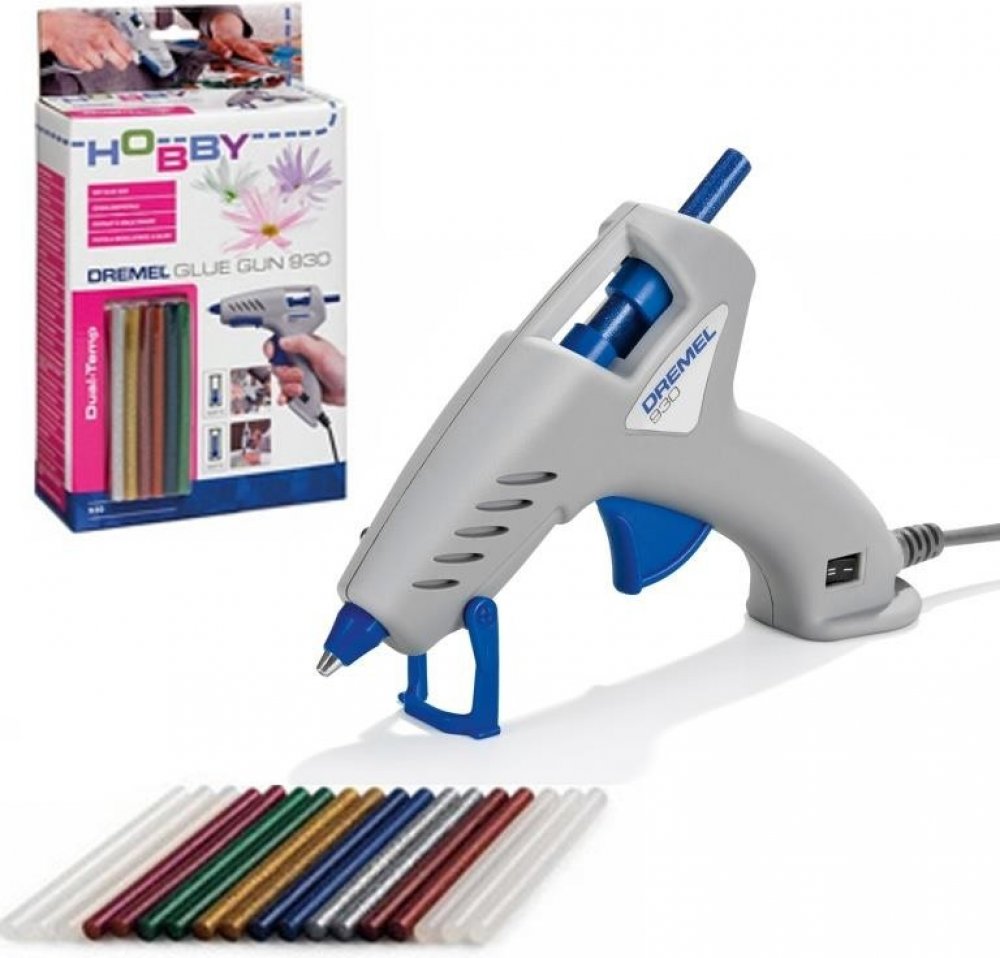 Dremel 930 je dvouteplotní lepicí pistole. Perfektní na zdobení standardních i tepelně citlivých materiálů. Včetně průhledných a barevných lepicích tyčinek pro kreativní řemeslnou práci. Od lehkého lepení po modelování dekorací, přesné zdobení sklenic a tvarování forem i rytí.