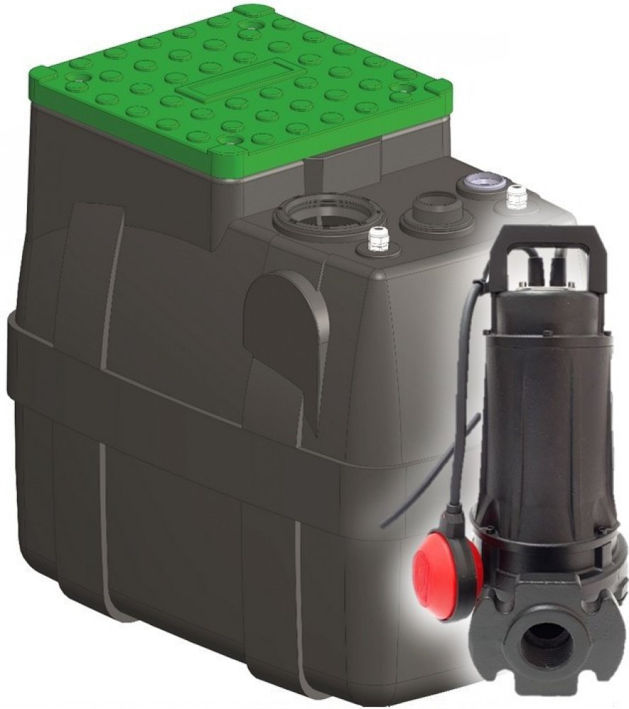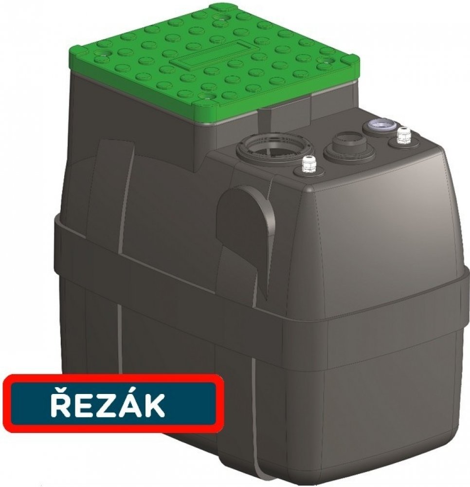 Přečerpávací jímka pro odčerpávání odpadních vod a domovních splašků. Kvalitní celolitinové čerpadlo s nerezovým řezákem, samonosná PE konstrukce s uzavíracím poklopem, objem 200l.
