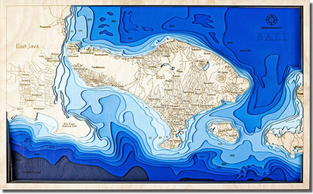 Dřevěná batymetrická námořní mapa - vícevrstvá 3D mapa Bali 60 cm x 38 cm