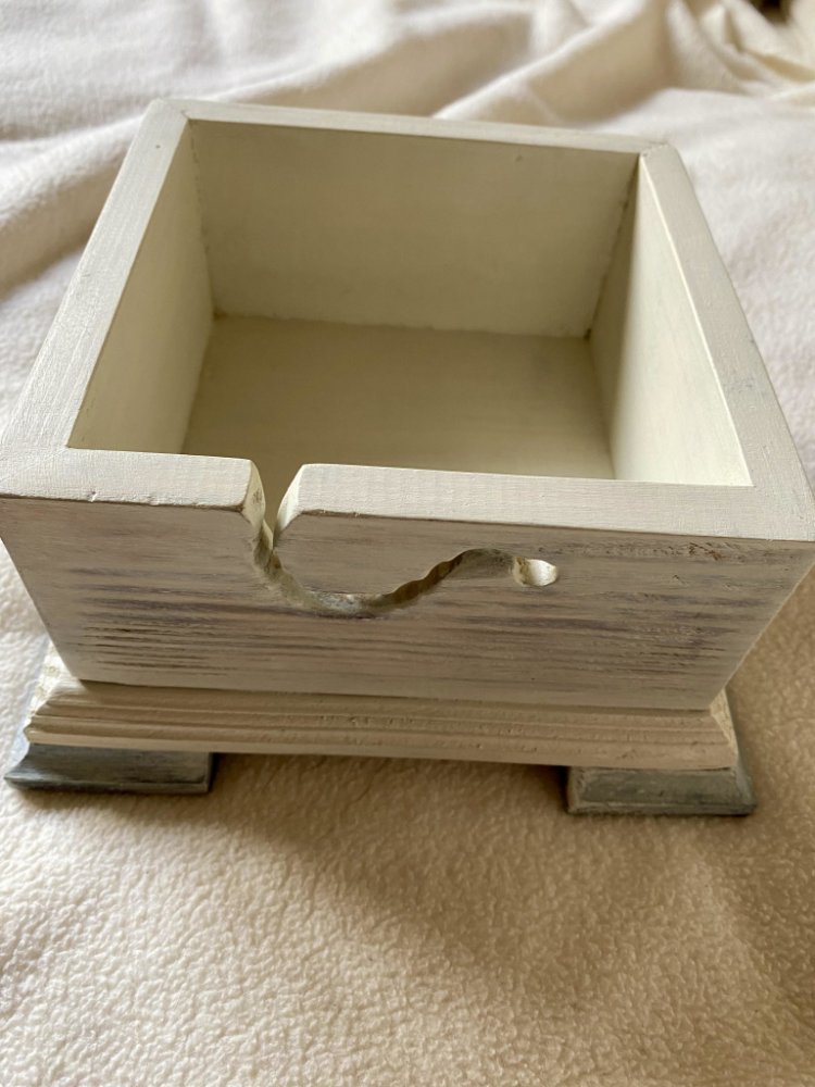 Každá miska je jedinečná a originální, jak tvarem, tak kresbou dřeva. Miska je natřena lehce bílým lakem tak, aby prosvítalo dřevo, takže vynikne kresba dřeva. Miska má spirálový otvor na vedení příze.