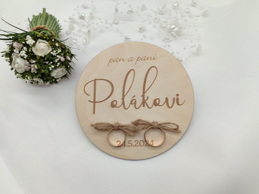 Dřevěné podložka na snubní prsteny se společným příjmením novomanželů a datem svatby je krásná a originální dekorace, která by rozhodně neměla chybět na žádné svatbě.