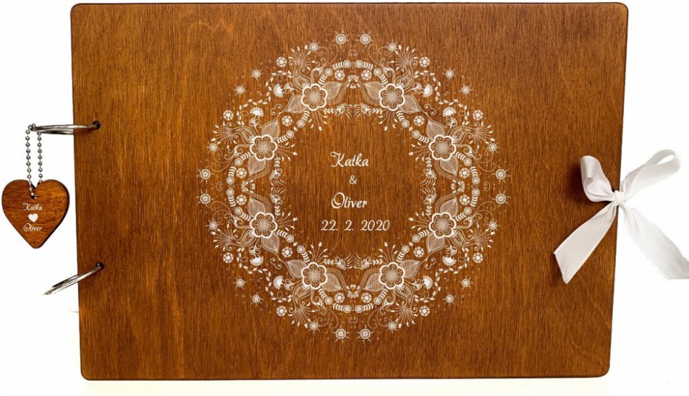 Svatební kniha o velikosti 22 cm x 32 cm je vyrobeno z kvalitního březového dřeva, do kterého je laserem gravírován nebo tištěn Váš text a vyobrazená grafika. Svatební kniha je vázaná dvěma kovovými kroužky a na výběr máte ze dvou barevných druhů vnitřního tvrdého kvalitního papíru velikosti A4 (Bílá 220 g/Černá 230 g). Fotoalbum obsahuje 1x barevný tvrdý papír, který prosvítá a určuje barvu srdíček. Dále máte k dispozici 30 listů tvrdého papíru. Celkem tedy máte 60 stran pro umístění Vašich fotografií a popisků.