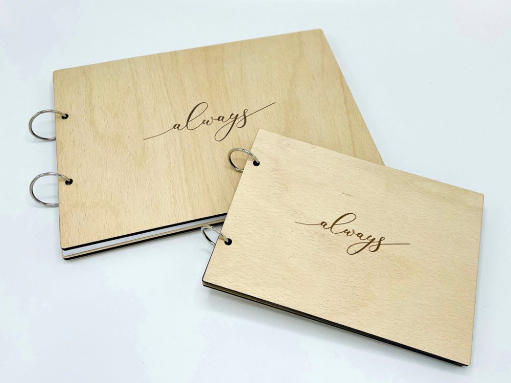 Album s pevnou dřevěnou vazbou a originálním vzorem - romantický nápis Always.