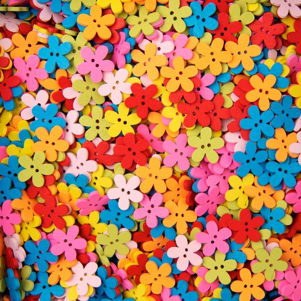 Pestrobarevná směs dřevěných knoflíků ve tvaru kytiček najde své uplatnění při tvoření s dětmi. S knoflíkovou aplikací můžete snadno trénovat jemnou motoriku, ať už budete knoflíčky přišívat nebo lepit. Jako podkladový materiál můžete využít například filc.