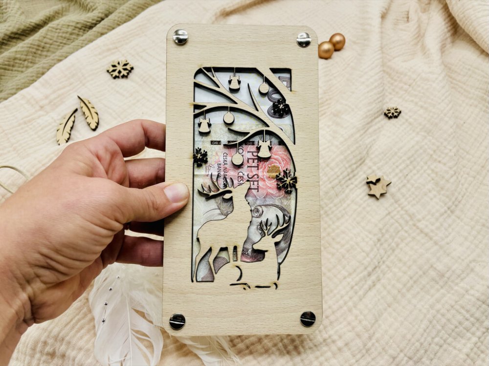 Dřevěné přání na darování peněz k Vánocům Sob