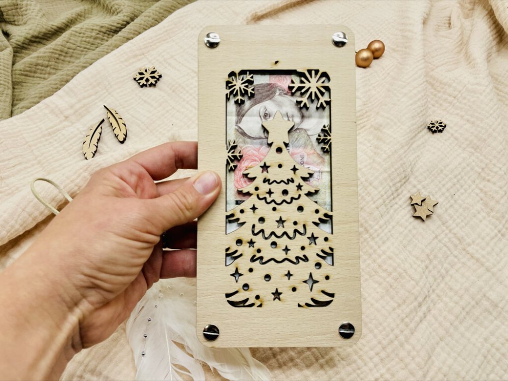 Dřevěná cedulka má vyřezaný vánoční stromeček a funguje jako rámeček na peníze.