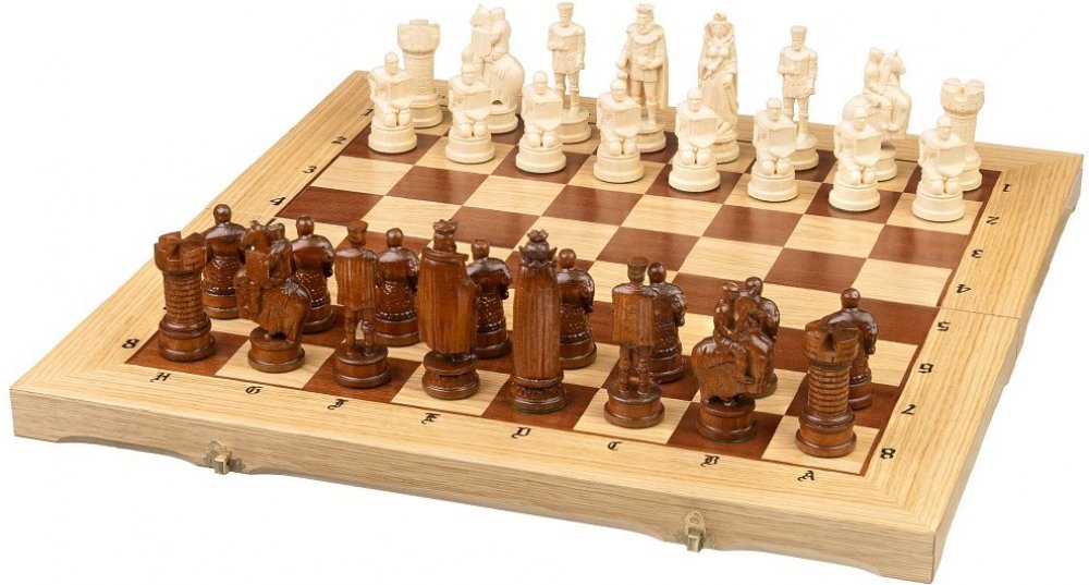 Exkluzivní, ručně vyřezávané šachy, velikost šachovnice 62 x 62 cm. Figurky jsou detailně zpracované z javorového dřeva, výška krále 12 cm. Skládací šachovnice s úložným prostorem a organizérem pro figurky. Skvostný kousek pro sběratele, nebo dekorace inspirována obdobím vlády Karla IV.