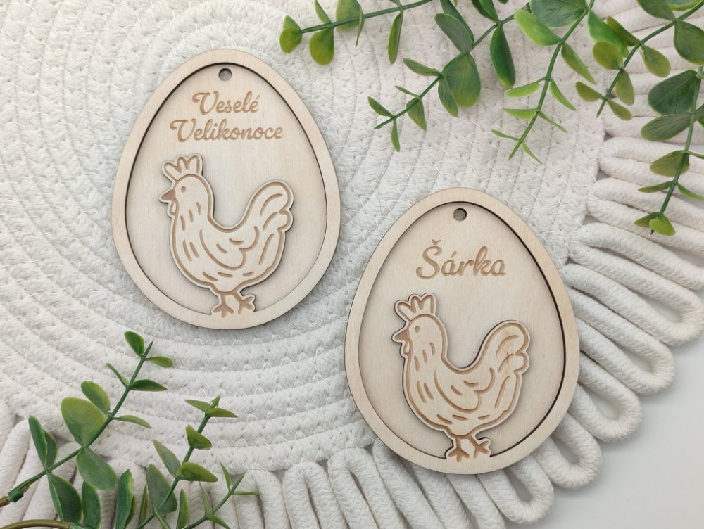Na výběr jsou dvě varianty – s univerzálním nápisem "Veselé Velikonoce" nebo se jménem na přání, díky čemuž může být vajíčko jedinečným dárkem pro Vaše blízké. V horní části má otvor, takže ho lze snadno zavěsit na barevnou stuhu pro veselou výzdobu, nebo na jutový provázek, pokud preferujete přírodní vzhled.