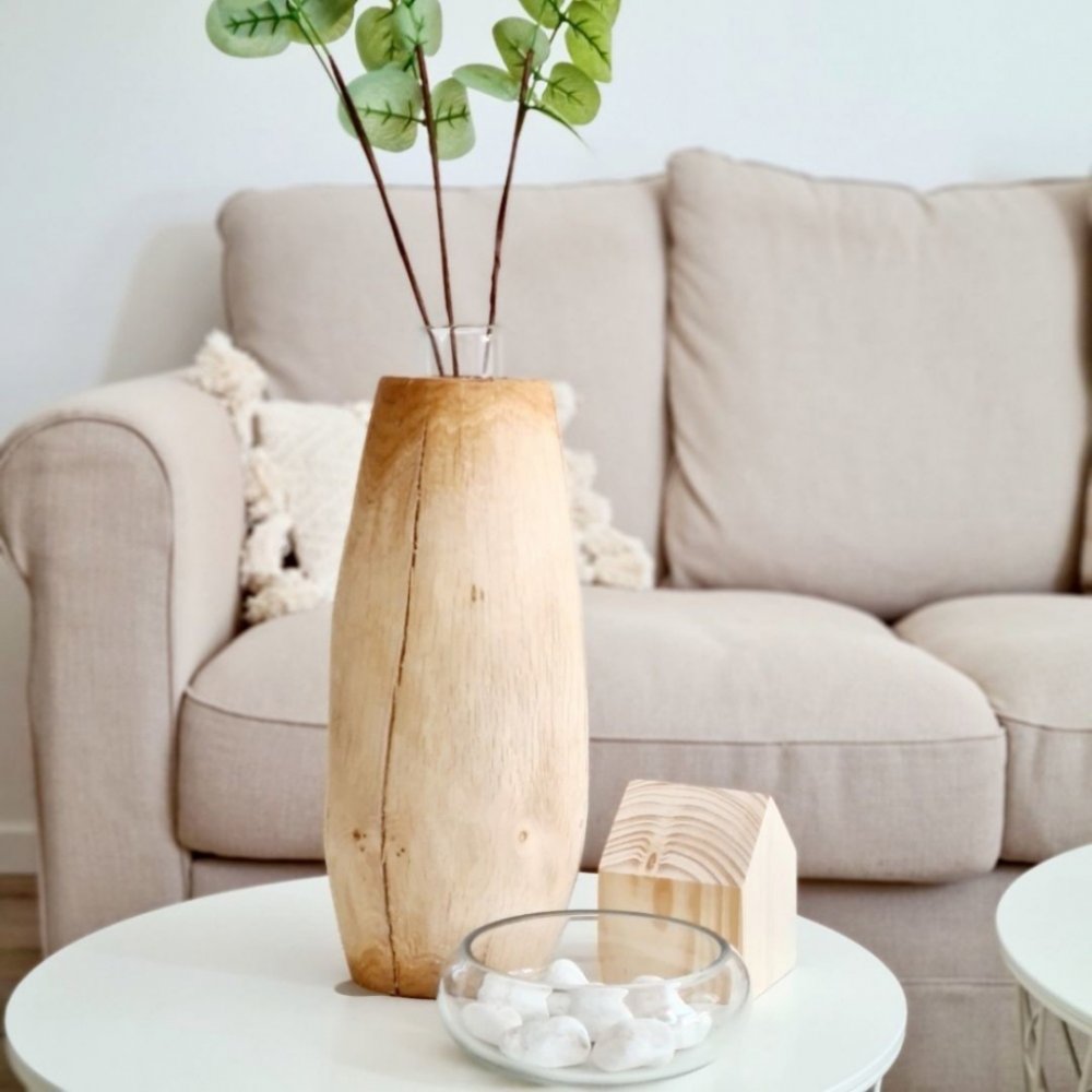 Každý kousek je originální a díky tomu mohou vzniknout barevné odchylky a jelikož je váza zhotovena z oschlého dřeva, tak se po zakoupení mohou vytvořit drobné praskliny.