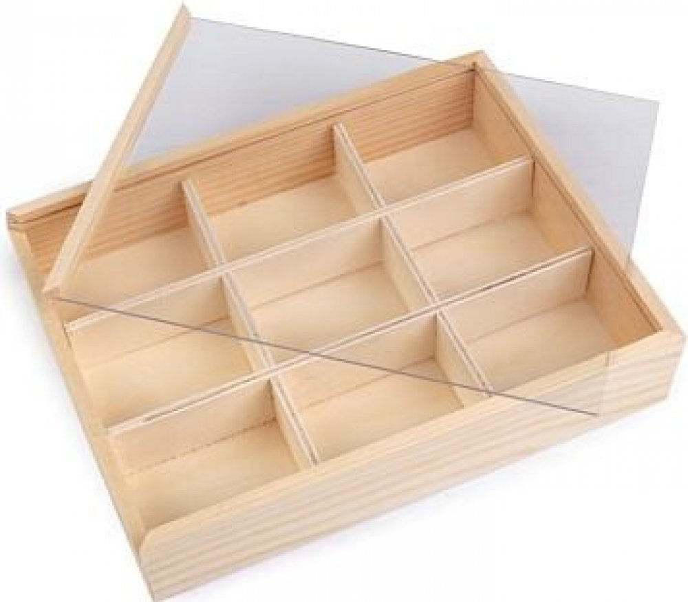 Dřevěný box (organizér) s posuvným průhledným víkem do kterého můžete uložit drobnou galanterii pro šití a kreativní tvoření. Organizér je ideální na knoflíky, korálky a jiné. Přihrádky v organizéru se dají vyjmout a velkou výhodou je i průhledné víko. Tento dřevěný box najde své využití i v domácnosti jako organizér do skříně, organizér na bižuterii, organizér do kuchyně anebo třeba na šroubky. N...