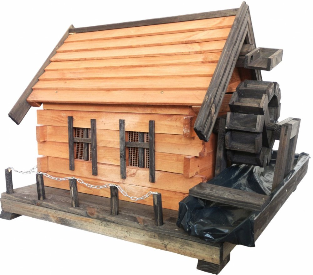 Mlýn je pokryt impregnací s přídavkem matného laku.Celý vyrobený z masivního borovicového dřeva.Má otočné mlýnské kolo a příkop, po které teče voda.Vyvedena hadice umožňuje připojení čerpadla, například z jezírka. Tekoucí voda která bude téct z vyvedené namontované hadičky v mlýně bude pohánět mlýnské kolo.Čerpadlo není součástí dodávky.Zábradlí vytvořené pomocí řetězu umožňuje dodatečně ozdobit m...