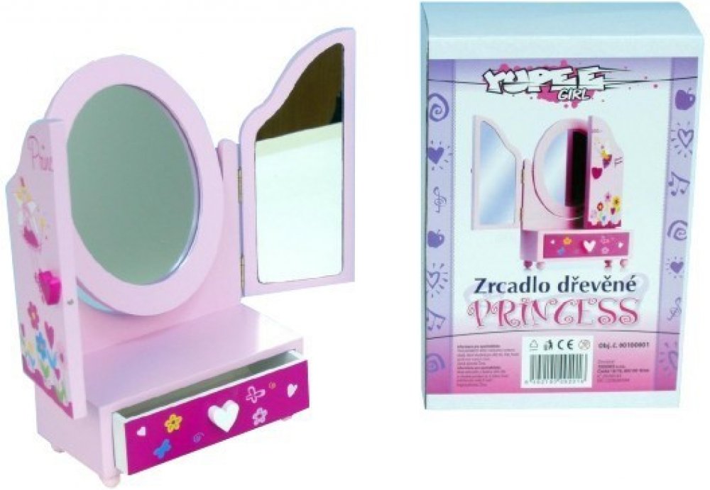 Dětská dřevěná šperkovnice se zrcadly, do které si mohou malé slečny ukrýt své náramky, prstýnky, korálky a jiné ozdoby.Šperkovnička je vyrobená ze dřeva v růžové barvě. Součástí dětské skříňky na špe