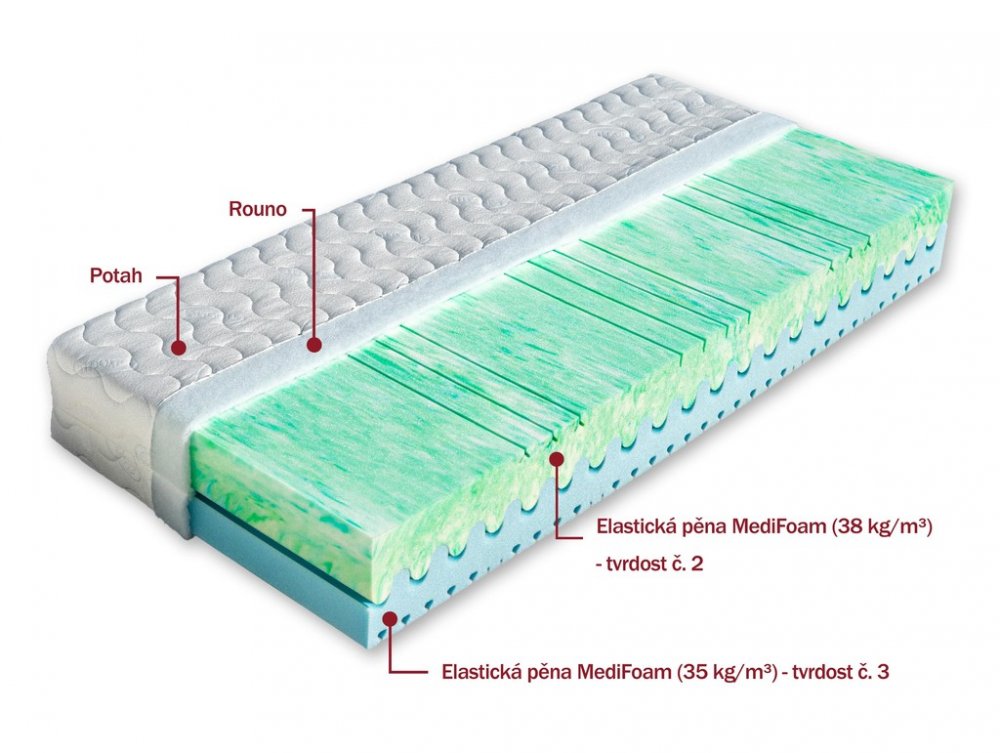 Tato vysoce gramážní pěna byla vytvořena speciální technologií, která se vyznačuje skvělými ortopedickými vlastnostmi. Má dokonalou prodyšnost, pružnost, je tvarově stálá a má dlouhou životnost. Zvýšená pórovitost je velmi dobrá k odvádění tepla z matrace, tato pěna tzv. dýchá. Matrace z pěny MediFoam zajišťují ideální uvolnění páteře, kloubů a svalů po dobu vašeho spánku. Jsou zdravotně testované a mají certifikát Textilního zkušebního ústavu, s. p. v Brně. Pěna MediFoam je garancí kvality.