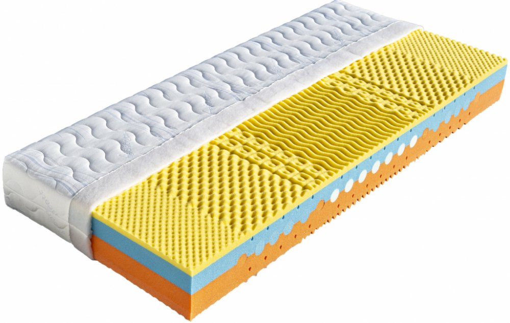 Matrace Brigita Luxusní matrace Brigita je tvořena perforovaným jádrem ze studené pěny dvou tuhostí s vloženými válci ze studených pěn různých tuhostí. Brigita je boustranná matrace, kde nosné vrstvy tvoří viscoelastická pěna, tvarovaná do masážních nopků, které zabezpečují dokonalé prokrvení pokožky a uvolnění svalů v průběhu spánku. Sedmizónové rozdělení nopů je důležité i ze zdravotního hledisk...