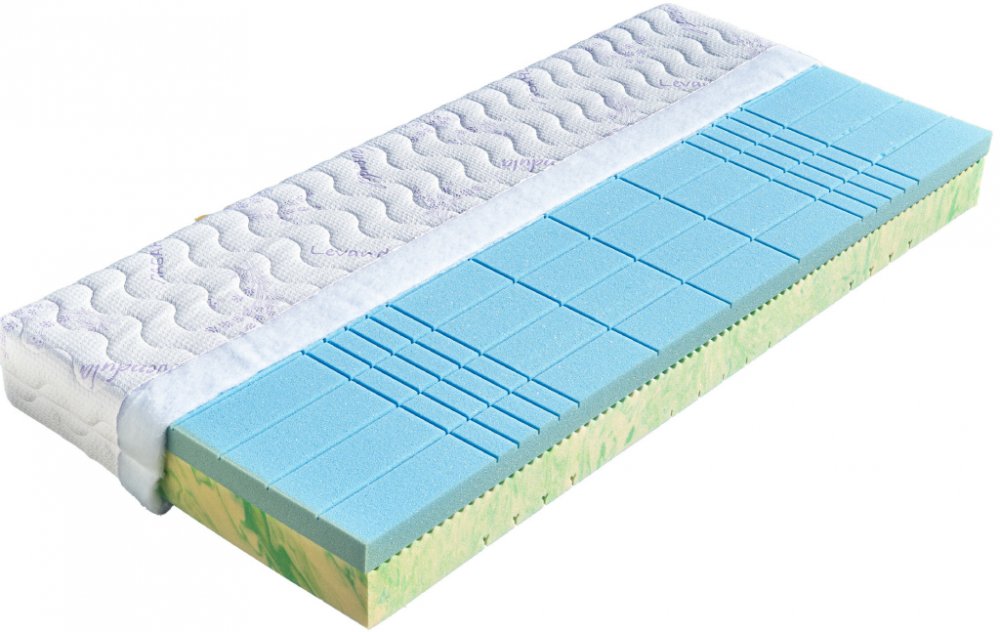 Modrá vrstva je vyšší liga. Je ze studené HR pěny, která velmi rychle reaguje na časté převalování. Umí pomoci při bolesti kloubů a páteře a má velmi dobrou prodyšnost, čímž snáze vyrovná tepelné rozdíly. I ona má příčné zářezy, které se přizpůsobí vašemu tělu a zároveň usnadňují cirkulaci vzduchu.