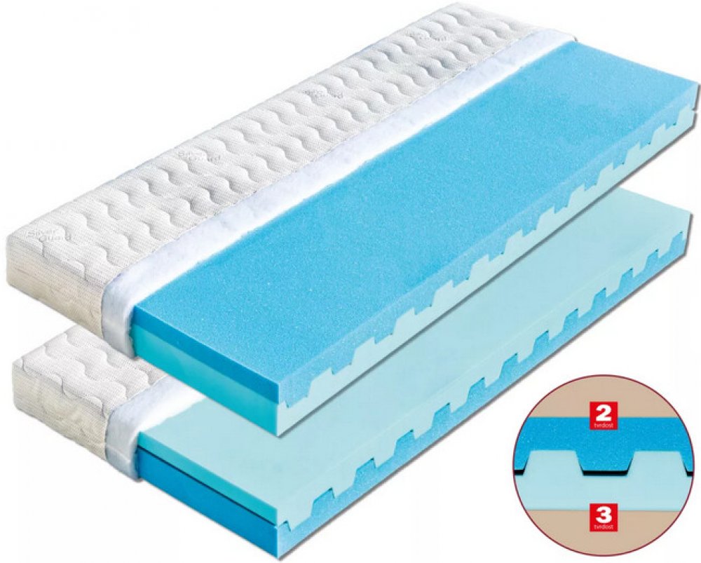 Podrobnosti o produktu MAT-55268 80 x 195 x 15 Tato matrace je ideální pro děti a mládež. Je složená ze dvou elastických pěn odlišných objemových hmotností a nabízí volbu dvojí tvrdosti. Měkčí stranu tvoří studená HR pěna (40 kg/m a sup3;), která je poddajná a velmi elastická. Naproti tomu světle modrá pěna MediFoam (35 kg/m a sup3;) je pevnější, s tvrdostí č. 3. Střed jádra matrace je provzdušněn...