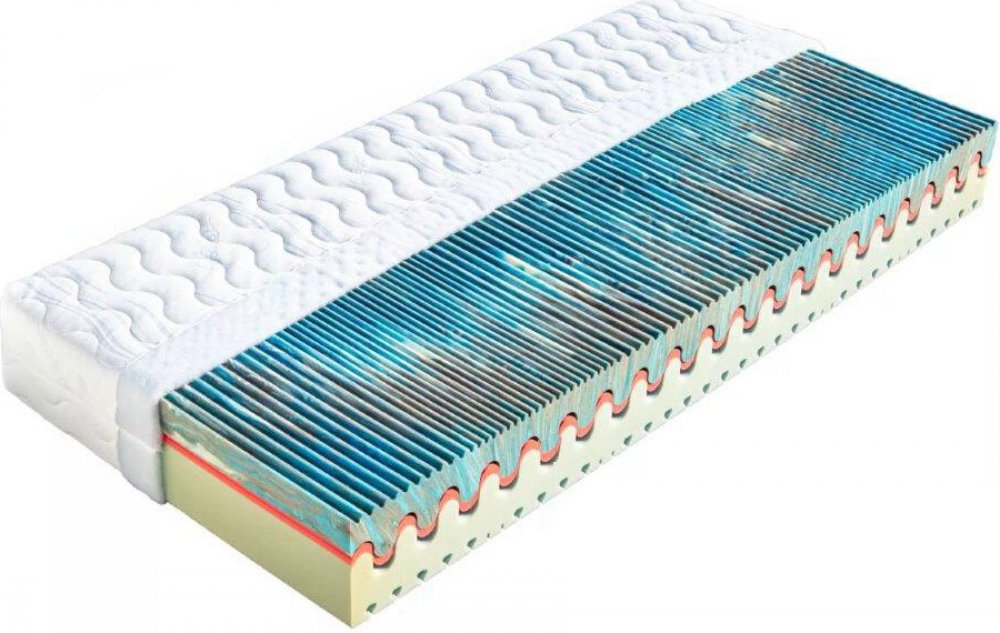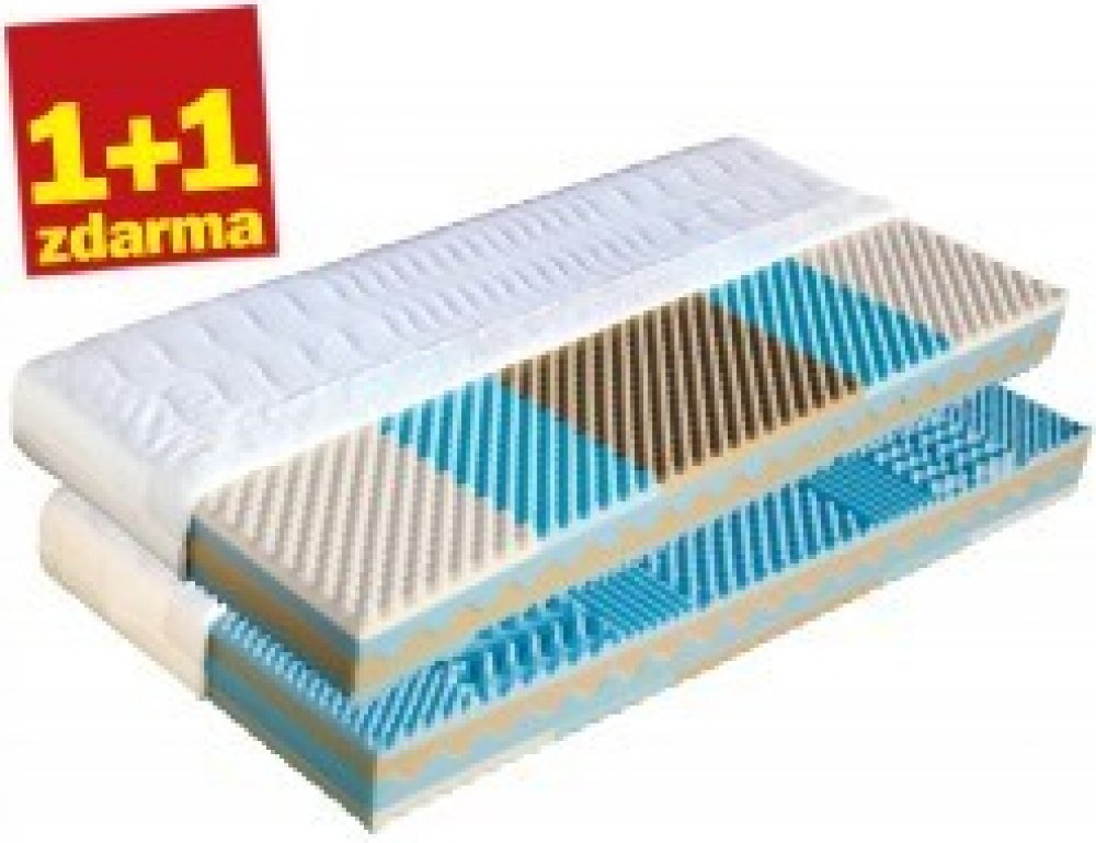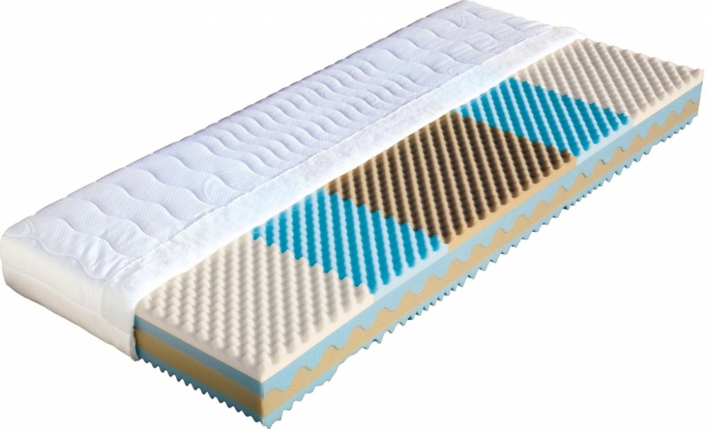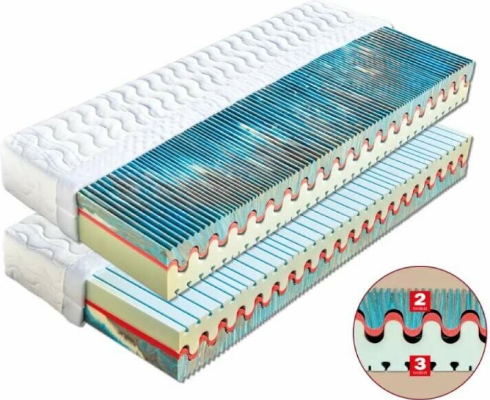 Sedmizónová matrace KARIBA s vlnkovitým jádrem, které je tvořeno kombinací dvou elastických pěn odlišných tuhostí. Nosná vrstva je tvořena kombinací pěn s odlišou tuhostí. Zatímco pod rameny a patami oceníte tužší zóny, pod bedry je potřeba mít pevnější podklad. Nopy napomáhají k relaxaci a prokrvení pokožky během spánku. Celková výška matrace je cca 20 cm. Objednejte 1 ks matrace Korsika a my Vám zašleme 2! Potah matrace: Úplet — Vyšší stupeň kvality v porovnání s froté potahem. Povrch je hladší a silnější. Je prošitý dutým vláknem s vyšší gramáží. Tímto způsobem se dosáhne lepší izolace od jádra matrace. Potah je prošitý třízónovým způsobem (střed má hustší prošití) Lyocell — Materiál z čistého přírodního vlákna získaného ze dřeva technologií šetřící životní prostředí. Se všemi svými vynikajícími charakteristikami Vám poskytuje během spánku optimální pohodlí. K jejím předním vlastnostem patří vysoká absorpční schopnost a velmi rychlé odpařování. Tyto vlastnosti zaručují dokonalý pocit i pro osoby s vyšší potivostí. Mikrovlákna Lenzing Lyocell dodávají látce hedvábný lesk a jsou odolná a necitlivá k mikroorganismům. Potah je možno prát při 60° C. AloeVera — Kvalitní potah, který obsahuje výtažek známé rostliny Aloe Vera Barbaensis z rodu liliovitých. Má pozitivní vliv na pokožku lidského těla, působí antibakteriálně. Postupně se uvolňující extrakt z AloeVera umožňuje dokonalou relaxaci ve spánku. Potah, prošitý třízónovým způsobem, je příjemný na dotek a standartně vetkané logo zaručuje nezaměnitelnost výrobku. Medicott — antibakteriální potah vhodný pro alergiky. Speciální složka zabraňuje vzniku plísní a usazování roztočů. Pro větší komfort je prošitý velkou vrstvou dutého vlákna. Medicott je účinná složka látky, která zabraňuje v bavlně nebo v látkách s bavlněným základem vzniku plísní a současně přežití prachových roztočů. Medicott má vynikající antibakteriální účinky, které jsou dosaženy bez přídavku chemických látek. Tajemství úspěšného fungování spočívá v odstranění nečistot z vláken přírodní bavlny, čímž se zamezí potenciálnímu domovu plísní. Potah má dlouhotrvající účinek při pravidelné údržbě. Lze ho prát při teplotě do 60 °C. Gramáž potahu 300 g/m2. Sanitized — Je antibakteriální potah, který nabízí dokonalou ochranu proti bakteriím a roztočům a zabraňuje rozmnožování mikroorganismů. Udržuje biologickou rovnováhu pokožky a přispívá k fyzickému a psychickému komfortu uživatele. Je dermatologicky testovaný a šetrný vůči pokožce, díky antimikrobiální úpravě Sanitized je revolučním řešením pro alergiky. Složení: 100% PES. Praní do 60 °C.