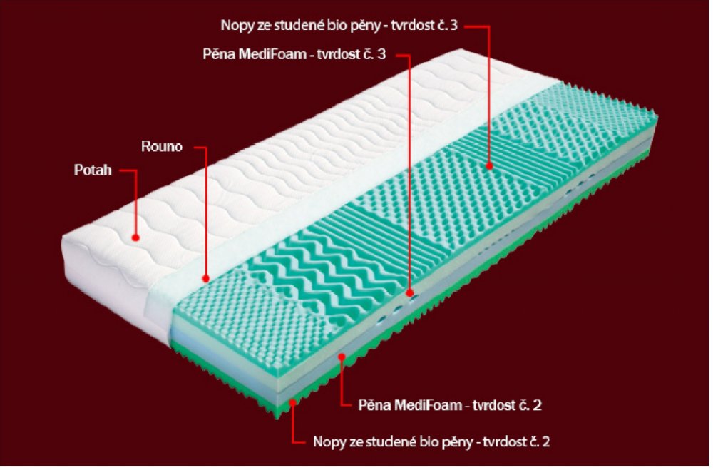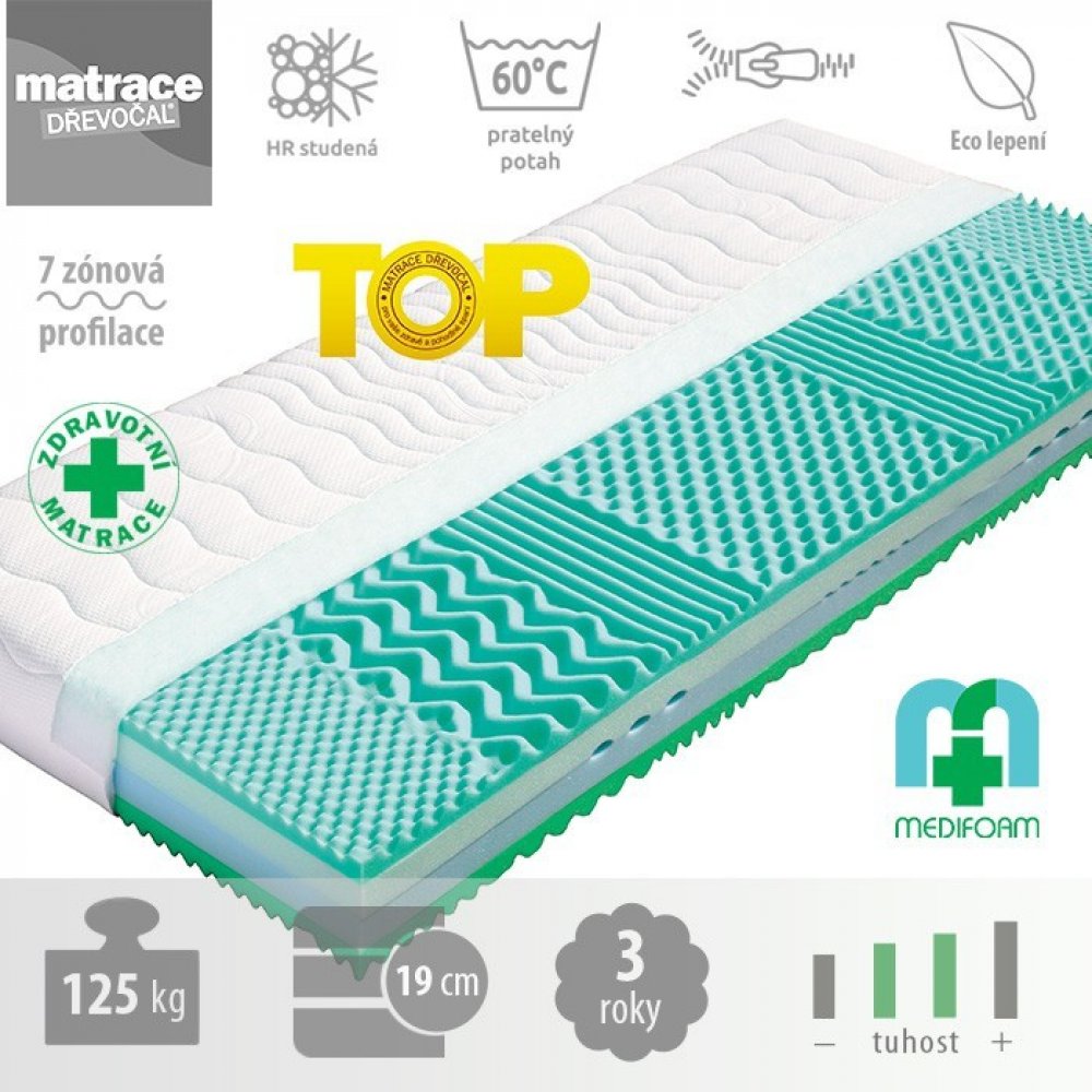 Tato vysoce gramážní pěna byla vytvořena speciální technologií, která se vyznačuje skvělými ortopedickými vlastnostmi. Má dokonalou prodyšnost, pružnost, je tvarově stálá a má dlouhou životnost. Zvýšená pórovitost je velmi dobrá k odvádění tepla z matrace, tato pěna tzv. dýchá. Matrace z pěny MediFoam zajišťují ideální uvolnění páteře, kloubů a svalů po dobu vašeho spánku. Jsou zdravotně testované a mají certifikát Textilního zkušebního ústavu, s. p. v Brně. Pěna MediFoam je garancí kvality.