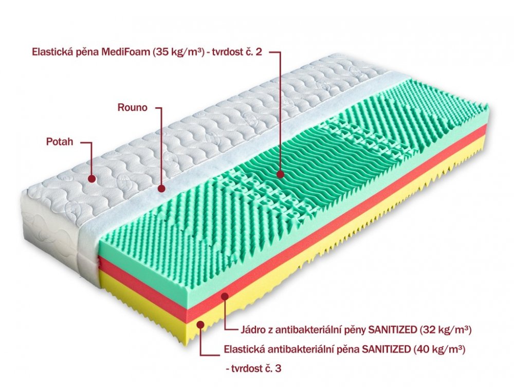 Luxusní matrace s variantou 2 tvrdostí z kvalitních antibakteriálních pěn. Červená střední část jádra zajišťuje optimální podporu těla. Tvoří ji antibakteriální pěna s úpravou Sanitized (32 kg/m³). Měkčí, tyrkysově zelená pěna MediFoam (35 kg/m³) je příjemně elastická (tvrdost č. 2). Pěna limetkové barvy s antibakteriální úpravou Sanitized je pevnější (tvrdost č. 3) a má vysokou gramáž (40 kg/m³)....