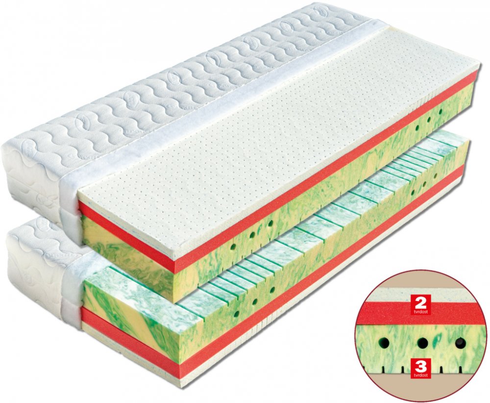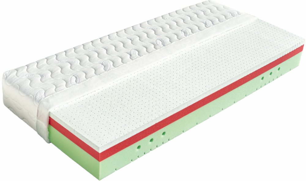 Zdravotní matrace Macon + polštář zdarma S bolavými zády pomůže zdravotní matrace Macon Základem zdravotní matrace Macon je PUR pěna zvaná MediFoam. Má velmi dobré ortopedické vlastnosti a její prodyšnost, pružnost a tvarová stálost dávají dobrý základ pro dlouhou životnost.Při spánku na ní uvolníte napjaté svaly, lehce prokrvíte pokožku apodpoříte zdravý spánek. Uprostřed matrace najdete příčné průduchy, které nejenže zajistí dobrou cirkulaci vzduchu, ale změkčí matraci v oblasti ramen, takže spánek na boku bude ještě příjemnější. Jedinečností zdravotní matrace Macon je bílý perforovaný latex, který v sobě obsahuje gelové mikrokapsle. Ty mají chladící efekt, takže se v noci nebudete přehřívat. Největší výsadou latexu je, že pomáhá s bolestí zad. Svou měkkostí a vysokou elasticitou se skvěle přizpůsobí vašemu tělu, podpoří ho a uleví bolavým svalům v okolí páteře. Drobné otvory na povrchu mají za úkol odvádět přebytečnou vlhkost a zachovat správnou cirkulaci vzduchu. Latex má navíc dlouhou životnost a je antialergický, takže brání tvorbě plísní a bakterií. Perforovaný latex je velmi pružný, proto je potřeba ho podpořit. Výrobce vybral antibakteriální pěnu zvanou Sanitized, která brání tvorbě bakterií a přežívání roztočů. Vaše lůžko tak bude vždy čisté. Pro koho je zdravotní matrace Macon vhodná? Zdravotní matrace Macon je ideální univerzální matrací s nosností 130 kg. Milovat ji budou ti, kteříchtějí pomoci od bolesti zad nebo je bolí za krkem. Libovat si budou i alergici, protože všechny vrstvy, díky velkým pórům, dýchají. Pro svých 5 zón je vhodná pro osoby od 150 cm.…