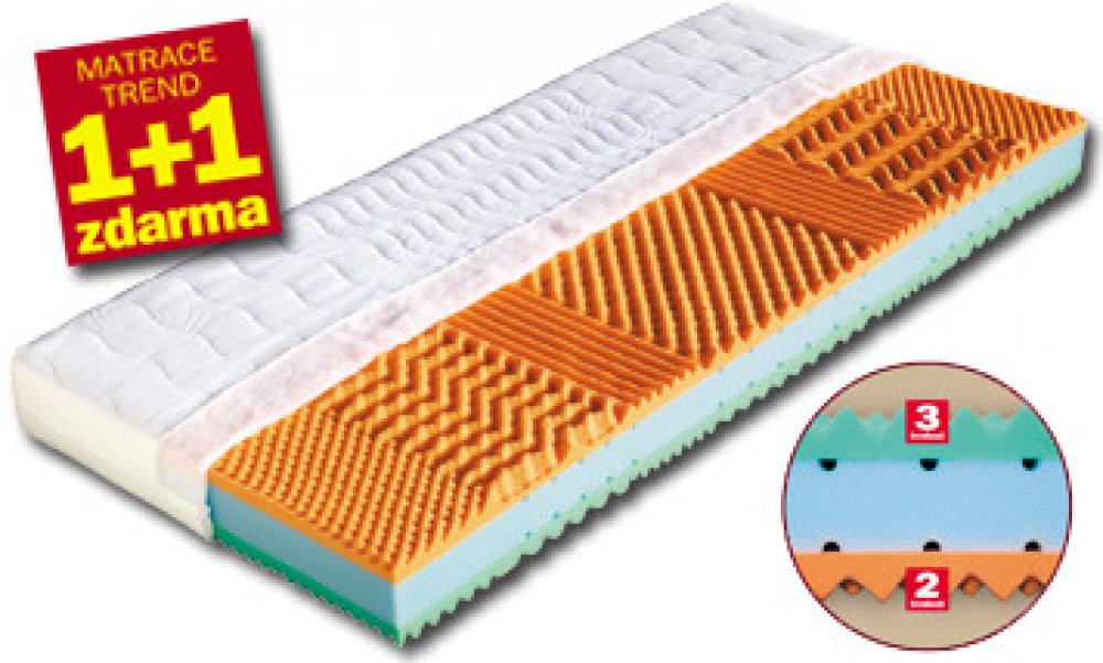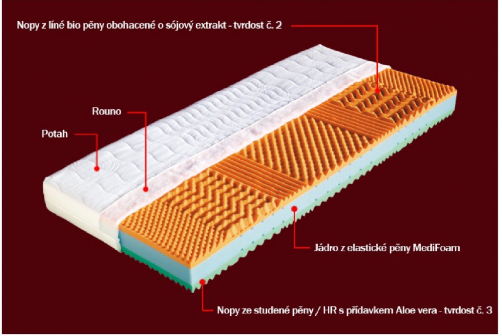Zelená nosná vrstva tvarovaná do masážních nopů je tvořena z kvalitní pěny MediFoam (35 kg/m a sup3;). Jádro matrace tvoří elastická pěna MediFoam (35 kg/m a sup3;), která je provzdušněna otvory zaručujícími ventilaci a změkčení matrace v oblasti ramen. Je vhodná pro všechny typy roštů. Klinicky testováno.