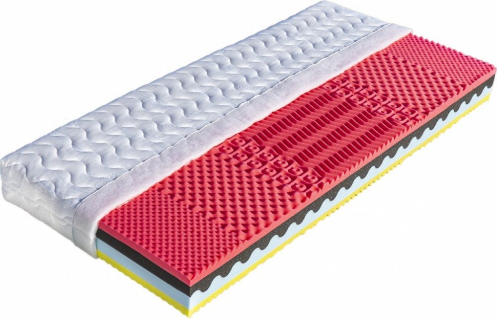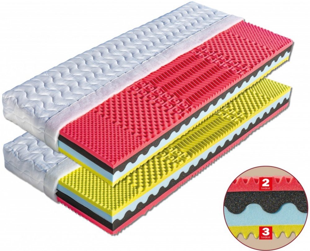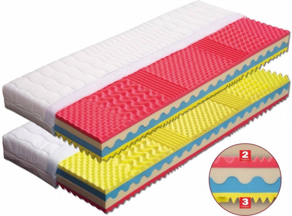 Podrobnosti o produktu MAT-88943 140 x 200 x 19 Jádro matrace se skládá ze dvou odlišných pěn zasazených do sebe podélnou vlnou. Černá pěna (35 kg/m a sup3;) je příjemně elastická, modrá tvrdší (35 kg/m a sup3;) s vyšším odporem proti stlačení. Každá strana matrace je tvořena vrstvou odolných pěn (32 a 40 kg/m a sup3;) Sanitized s rozdílnou tuhostí ložných ploch, tvarovaných do masážních nopů. Dík...