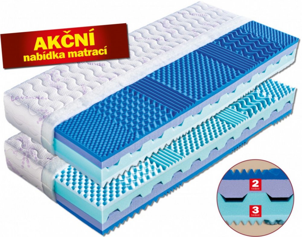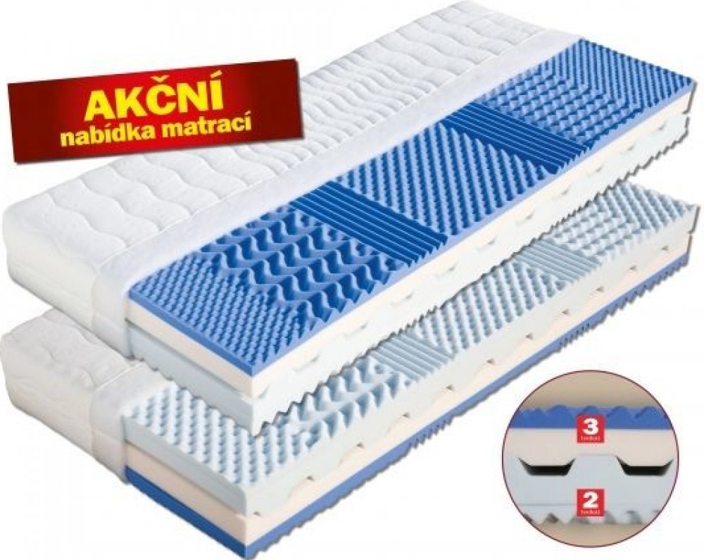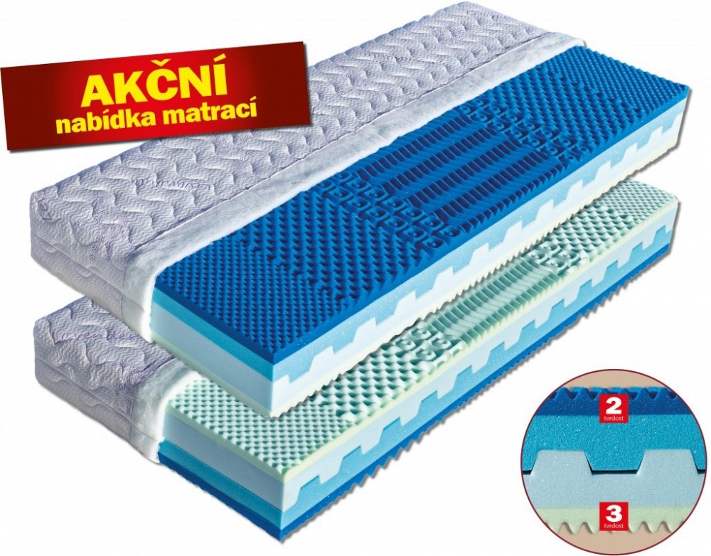 Podrobnosti o produktu MAT-58538 80 x 195 x 23 Vrchní modrá vrstva je tvořena viscoelastickou pěnou (50 kg/m a sup3;). Tato pěna Vám zajistí optimální rozložení váhy těla na matraci. Provzdušněné jádro s příčnými průduchy je složené z vrstvy extra prodyšné studené HR pěny (40 kg/m a sup3;) s dokonalou elasticitou a z tvrzené elastické pěny MediFoam (35 kg/m a sup3;). Druhou vrchní vrstvu tvarovano...