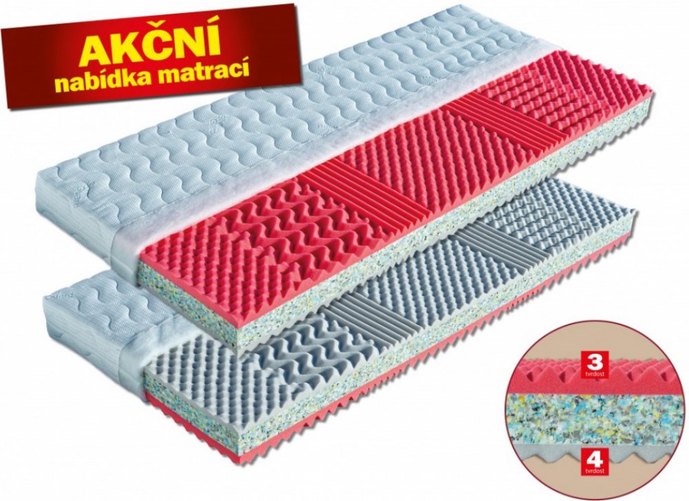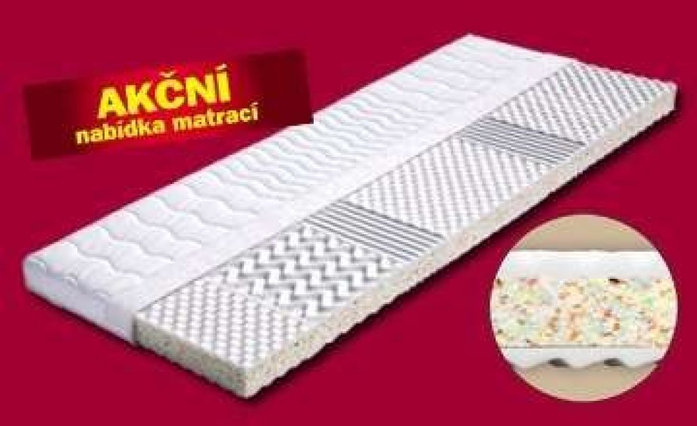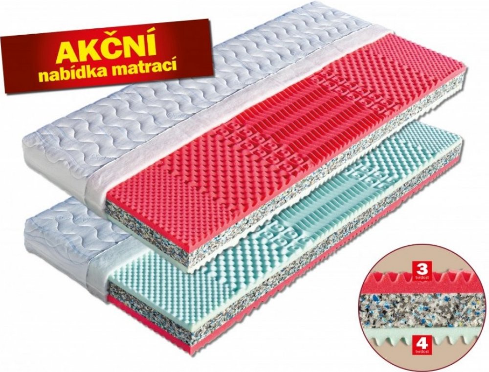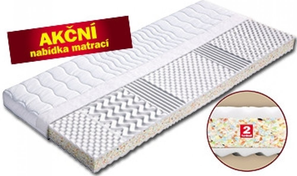 Podrobnosti o produktu MAT-44899 160 x 200 x 15 Sendvičová matrace s jádrem z pojeného polyuretanu (PUR RE 80) ve výšce 7 cm. Vrchní stranu matrace tvoří elastická antibakteriální pěna tvarovaná do nopů s úpravou Sanitized (32 kg/m a sup3;). Poskytuje trvalou a účinnou ochranu proti bakteriím, roztočům a plísním. Druhou stranu tvoří tvrdší pěna MediFoam (32 kg/m a sup3;), taktéž tvarovaná do masáž...