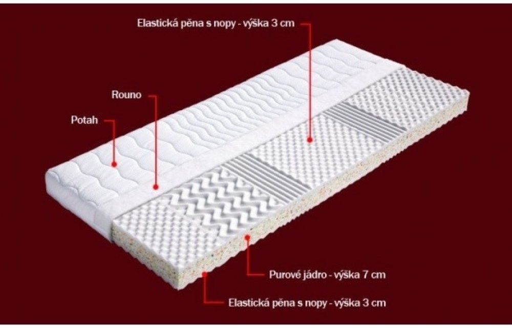PUR pěna - Polyuretanová pěna se vyznačuje dobrou elasticitou a tvarovou stálostí. U jader matraci používáme pěnu vyšší objemové hmotnosti, případně vrstvu pojeného polyuretanu PUR RE 80. Tyto pěny jsou odolnější a snesou větší zatížení. Polyuretanové matrace jsou nejrozšířenější na trhu.