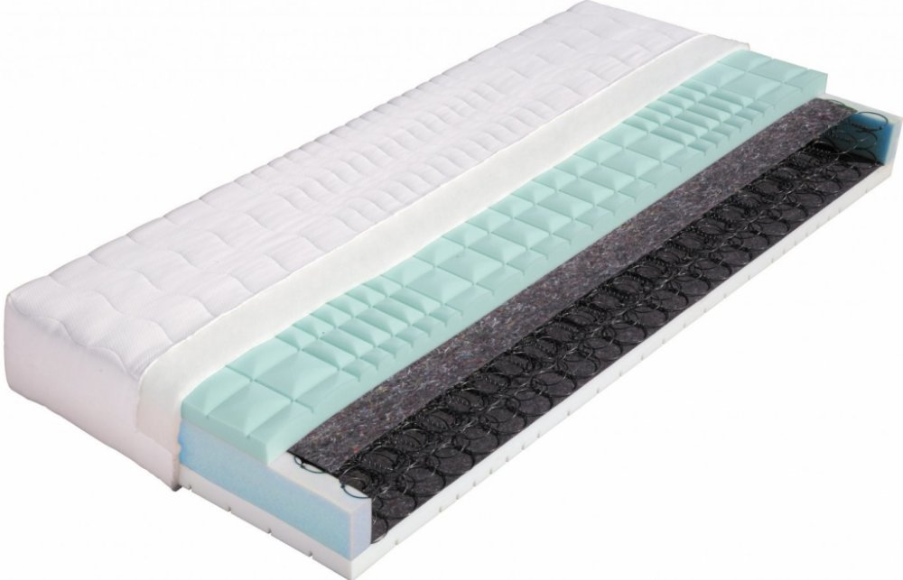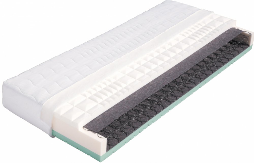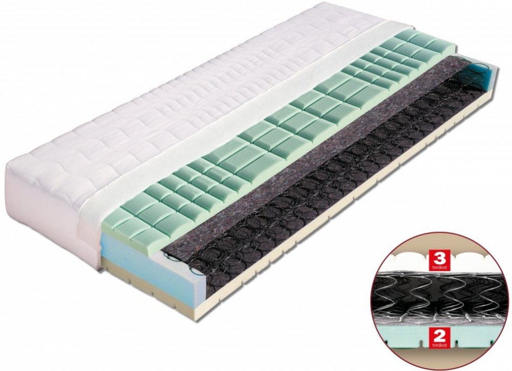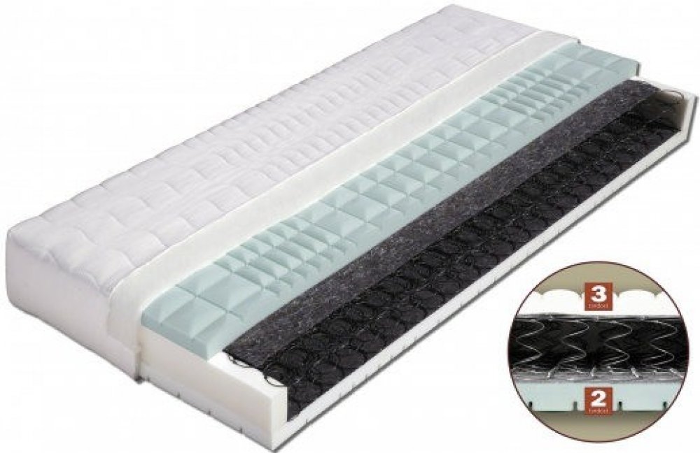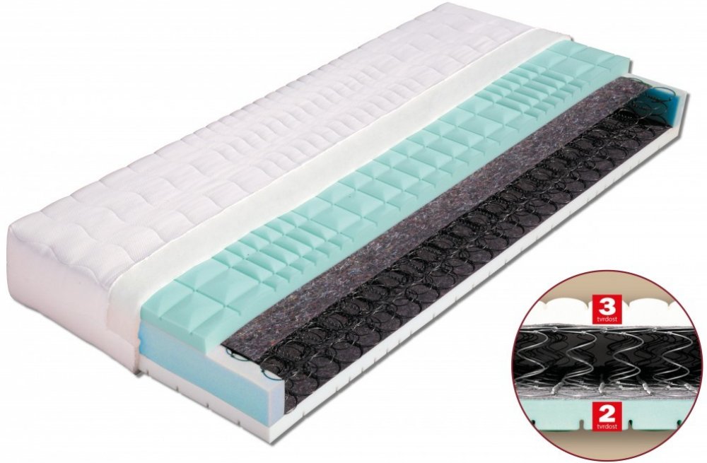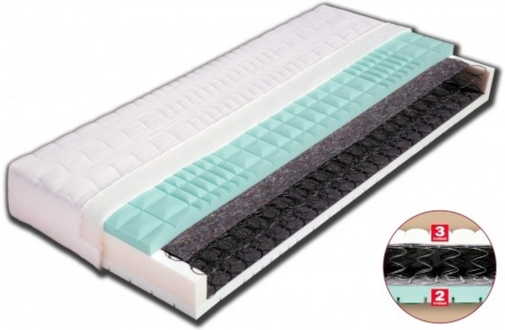 Podrobnosti o produktu MAT-55283 85 x 195 x 24 Velmi kvalitní pružinová matrace vrstvená elastickými pěnami MediFoam (28 a 30 kg/m a sup3;) různých objemových hmotností, rozdělených do 7 anatomických zón s antidekubitním průřezem (zamezující vzniku proleženin) . Výška jádra poskytuje uživateli komfort, pevnou anatomickou oporu páteře a zároveň zajišťuje vysokou vzdušnost matrace. Pružinové matrace...