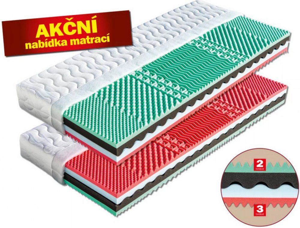 Podrobnosti o produktu MAT-89916 120 x 200 x 19 Jádro této matrace se skládá ze dvou odlišných pěn zasazených do sebe podélnou vlnou. Černá pěna je příjemně elastická (35 kg/m a sup3;), modrá tvrdší (35 kg/m a sup3;) s vyšším odporem proti stlačení. Vrchní měkčí ložná vrstva tvarovaná do nopů s antibakteriálním účinkem (32 kg/m a sup3;) zabezpečuje harmonický spánek. Zelená ložná plocha ve tvaru n...