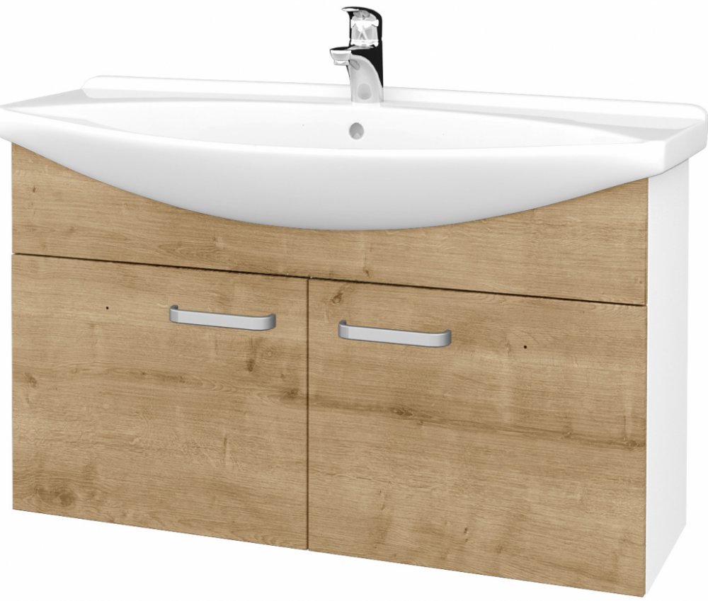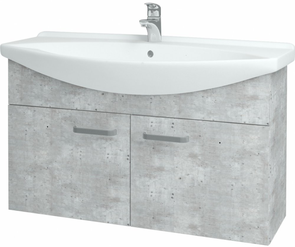Závěsná skříňka pod umyvadlo TAKE IT SZD2 105. Skříňku můžete mít buď v bílé barvě, v imitaci betonu či v několika motivech dřeva. Součástí skříňky je keramické umyvadlo DREJA PLUS 105, které má v zadní části odkládací plochu.