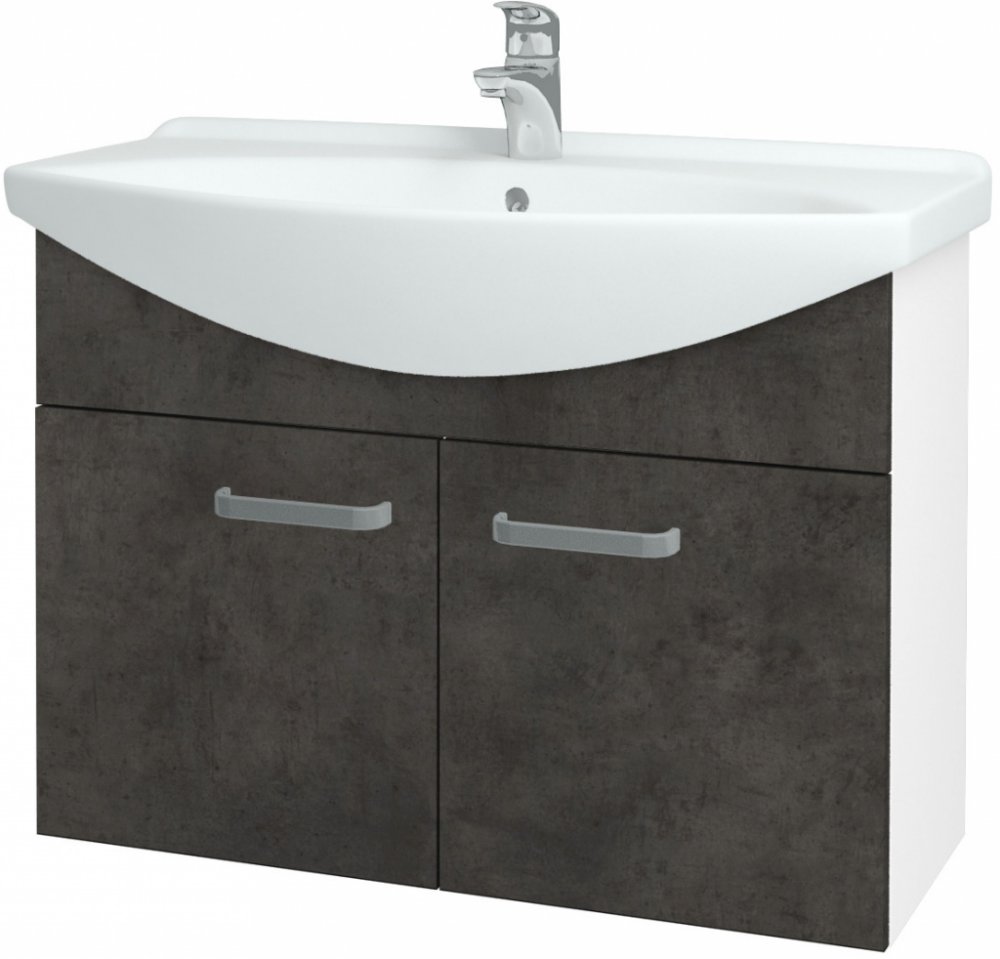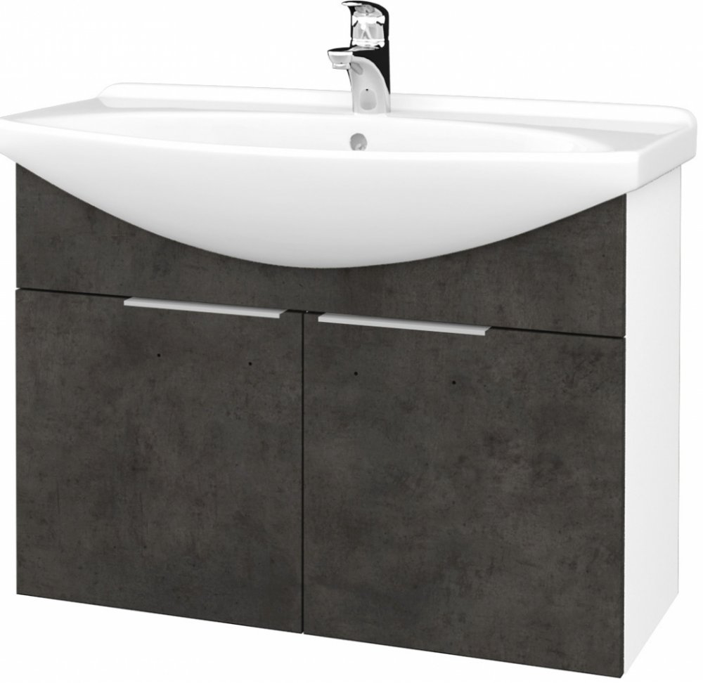 Závěsná skříňka pod umyvadlo TAKE IT SZD2 85. Skříňku můžete mít buď v bílé barvě, v imitaci betonu či v několika motivech dřeva. Součástí skříňky je keramické umyvadlo DREJA PLUS 85, které má v zadní části odkládací plochu.