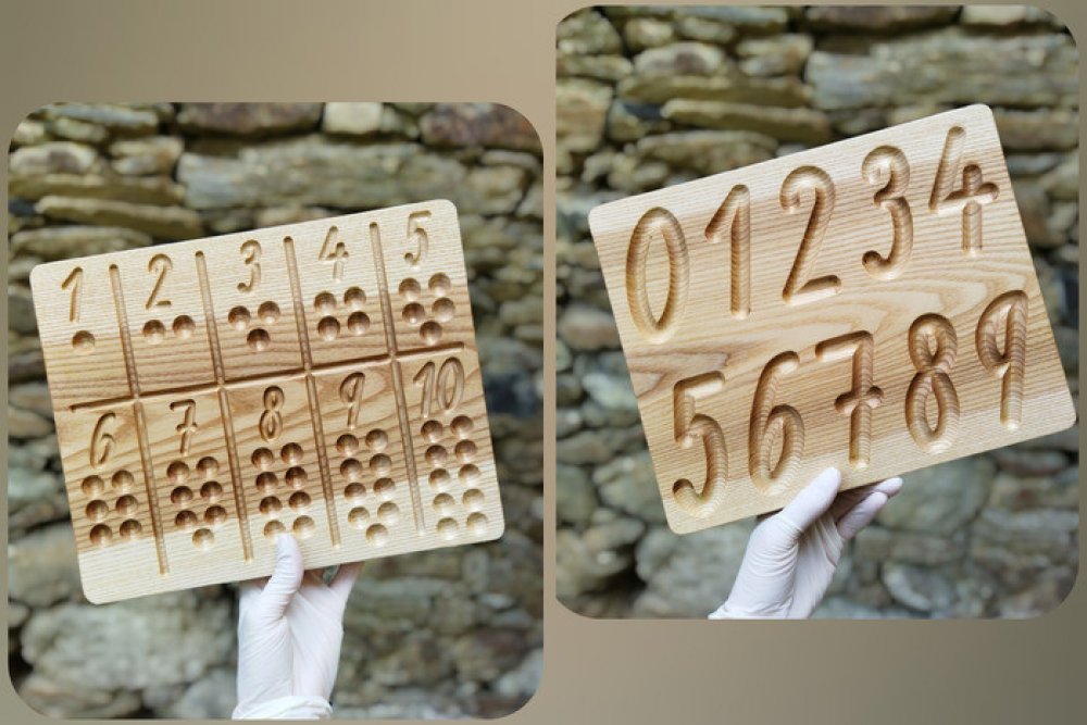 Grafomotorická oboustranná tabulka - smyslová hra pro děti pro rozvoj grafomotoriky a učení čísel. Dřevěná motorická hra je skvělou výukovou pomůckou pro předškoláky pro psaní a počítání čísel. K tabulce je přiložena buková "tužka" 0,8 cm a 60 ks bukových kuliček 1,2 cm.