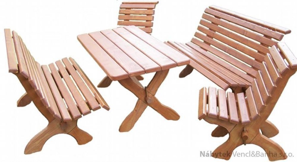 Dřevěný zahradní nábytek je ideální pro vaše venkovní posezení. Sestava zahrnuje jeden stůl, dvě lavice a dvě křesla. Je vyrobená z jehličnatého dřeva a ošetřená mořidlem (možnost výběru odstínu dle vašich preferencí).