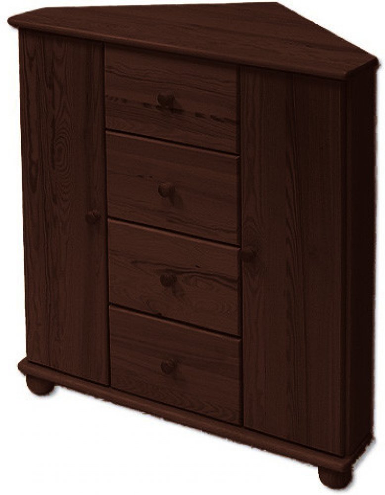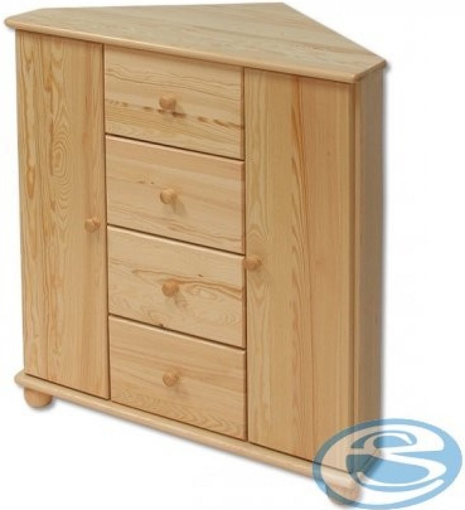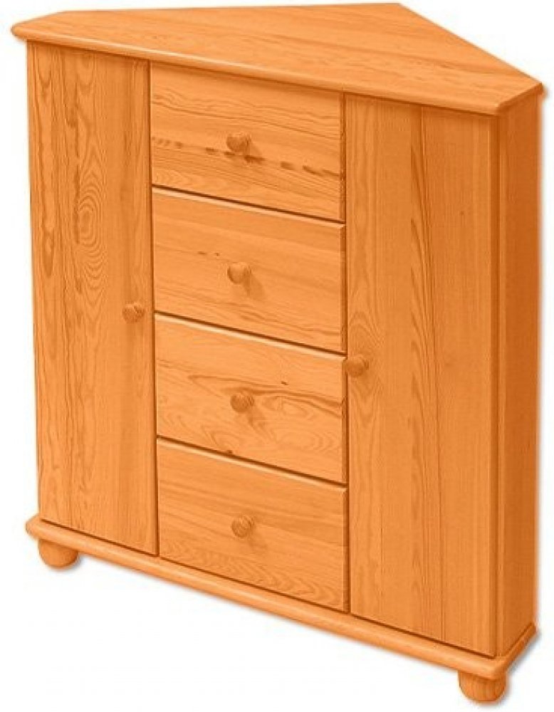 Kvalitní dřevěná komoda je vyrobena z borovicového masivu. Nabízí k ukládání čtyři zásuvky (šuplíky) a dvě skříňky se dvířky. Komoda má zkosený tvar pro vyplnění rohu místnosti. Hrany půdy a dna jso...